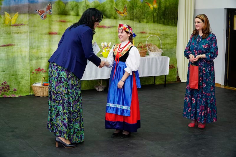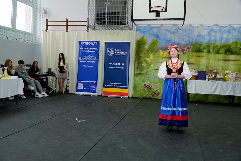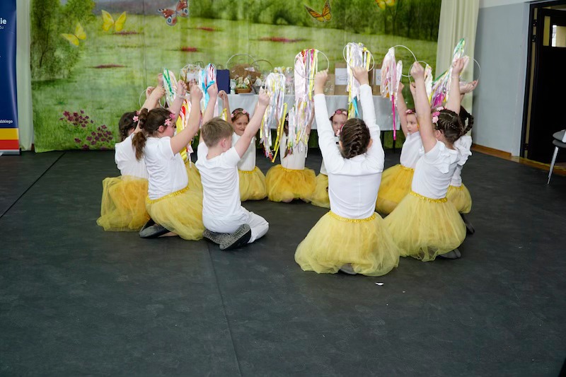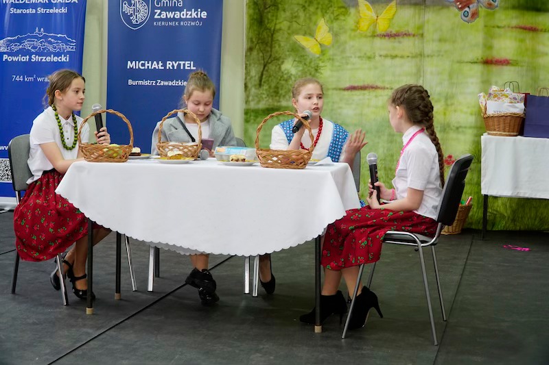Dowiedzieliśmy się, że kura wcale nie musi znosić złotych jaj, żeby była doceniana. Zobaczyliśmy, że koszyczki nie tylko coś noszą, ale i wirują w tańcu. Także wiosna, która już tuż, tuż – została wyczarowana przez młode tancerki. Zabawna scenka ukazała nam jakie są obecnie trendy zdobienia jaj. Roztańczonym dziewczętom psikusa zrobili młodzieńcy, którzy pokazali, co to znaczy śmigus- dyngus. O tym, dokąd poszła pewna dzieweczka zaśpiewała urocza pieśniareczka, a wielu gości nuciło wraz z nią tę tradycyjną melodię.
